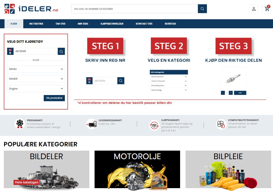 Det første hinderet for enhver kunde som leter etter bildeler er: «Passer denne delen til min bil?» Cateno implementerte en søkeløsning basert på bilens registreringsnummer. Ved å koble iDeler sin nettbutikk direkte mot kjøretøydata, eliminerte vi usikkerheten. Når kunden taster inn skiltnummeret, skjer følgende i bakgrunnen: